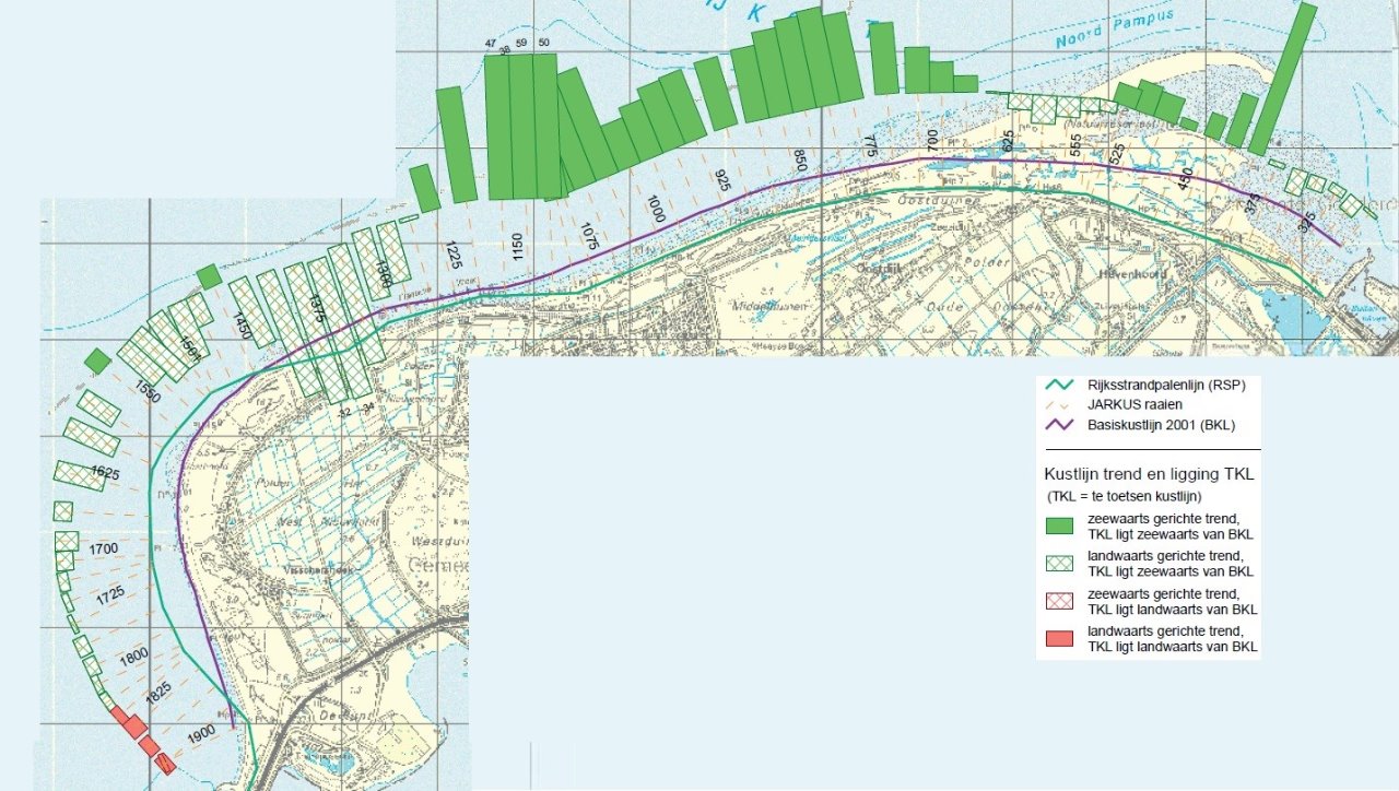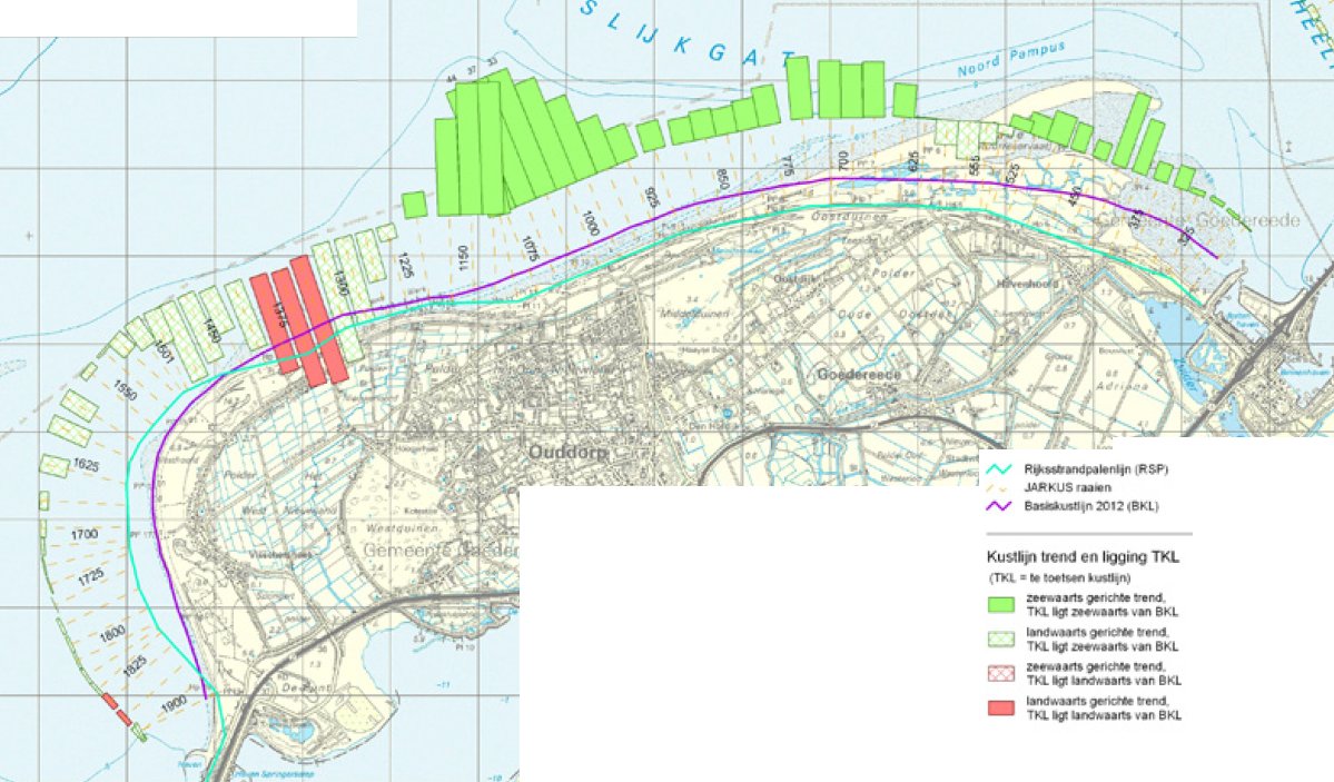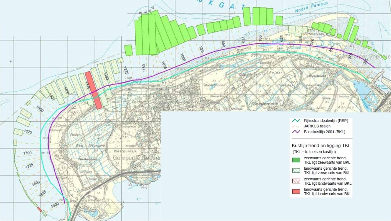 Hieronder is de kustlijnkaart van de kop van Goeree weergegeven. Duidelijk is te zien dat aan de noord-oostzijde van de Kop van Goeree sprake van erosie en aan de de noord- en westzijde landaangroei. De solid rode kleur ter hoogte van raai 1300- 1400 betekent dat de kustlijn landwaarts ligt van de BKL, de norm wordt hier overschreden. Dit zou reden kunnen te kiezen voor zandsuppletie.